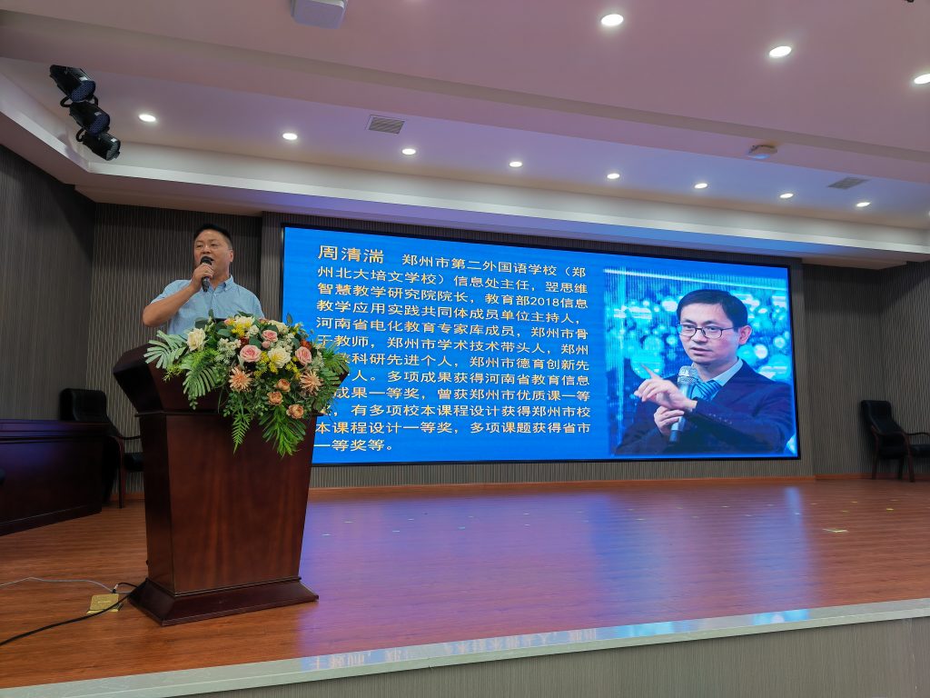 為進一步提高教師數(shù)字化教學(xué)水平,實現(xiàn)課堂提質(zhì)增效,為新一輪的中考勝利保駕護航。在仙源學(xué)校2023年暑期為期5天的校本培訓(xùn)期間, ESWI智慧教育學(xué)校聯(lián)盟成員校鄭州第二外國語學(xué)校周清湍主任再次受邀入校進行教育數(shù)字化專題培訓(xùn),吹響了新學(xué)期奮勇爭先、銳意改革的號角。周清湍主任作為河南省電化教育專家?guī)斐蓡T、河南省學(xué)術(shù)技術(shù)帶頭人、在學(xué)校智慧課堂信息化教學(xué)應(yīng)用方面深化教學(xué)改革、探索信息化與課堂融合方面做出了卓越貢獻,積累了豐富的、可推廣的案例與經(jīng)驗。本次培訓(xùn)是周主任自2020年起在仙源學(xué)校開展的第二次培訓(xùn)。