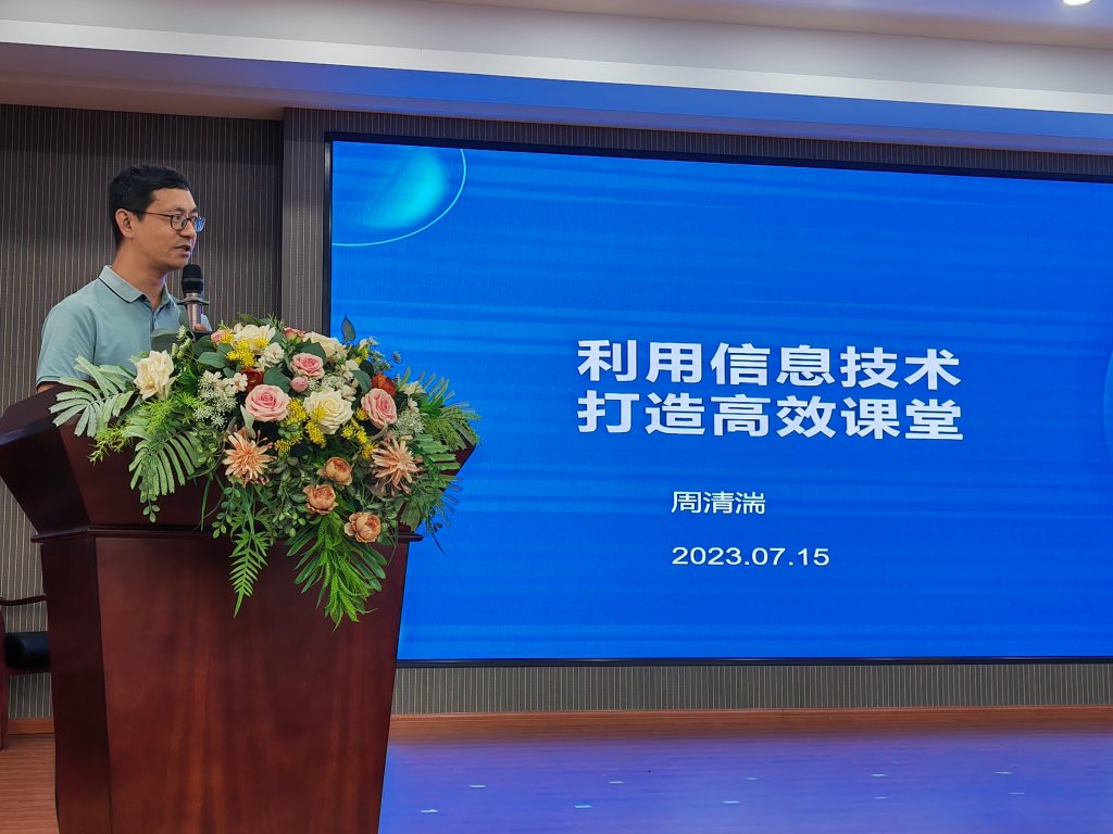 7月15日上午,學(xué)校領(lǐng)導(dǎo)與全體教師集聚本部報告廳聽取周主任有關(guān)《利用信息技術(shù)打造高效課堂》的精彩報告。周主任從以“教”為中心的傳統(tǒng)教學(xué)與以“學(xué)”為中心的現(xiàn)代教學(xué)之間的區(qū)別,智能時代翻轉(zhuǎn)課堂,項目式學(xué)習(xí)與數(shù)據(jù)驅(qū)動的個性化教學(xué)之間的內(nèi)在邏輯,如何對學(xué)生進行動態(tài)分組并組織學(xué)生合作學(xué)習(xí),如何進行教學(xué)設(shè)計開展高效教學(xué)等幾個方面,結(jié)合自身實踐案例,由淺入深,給出了全面的、體系化的講解,使參會教師豁然開朗,受到學(xué)校領(lǐng)導(dǎo)老師們的一致好評。