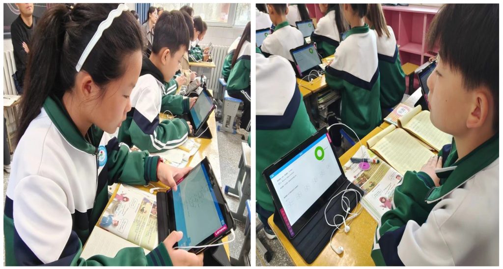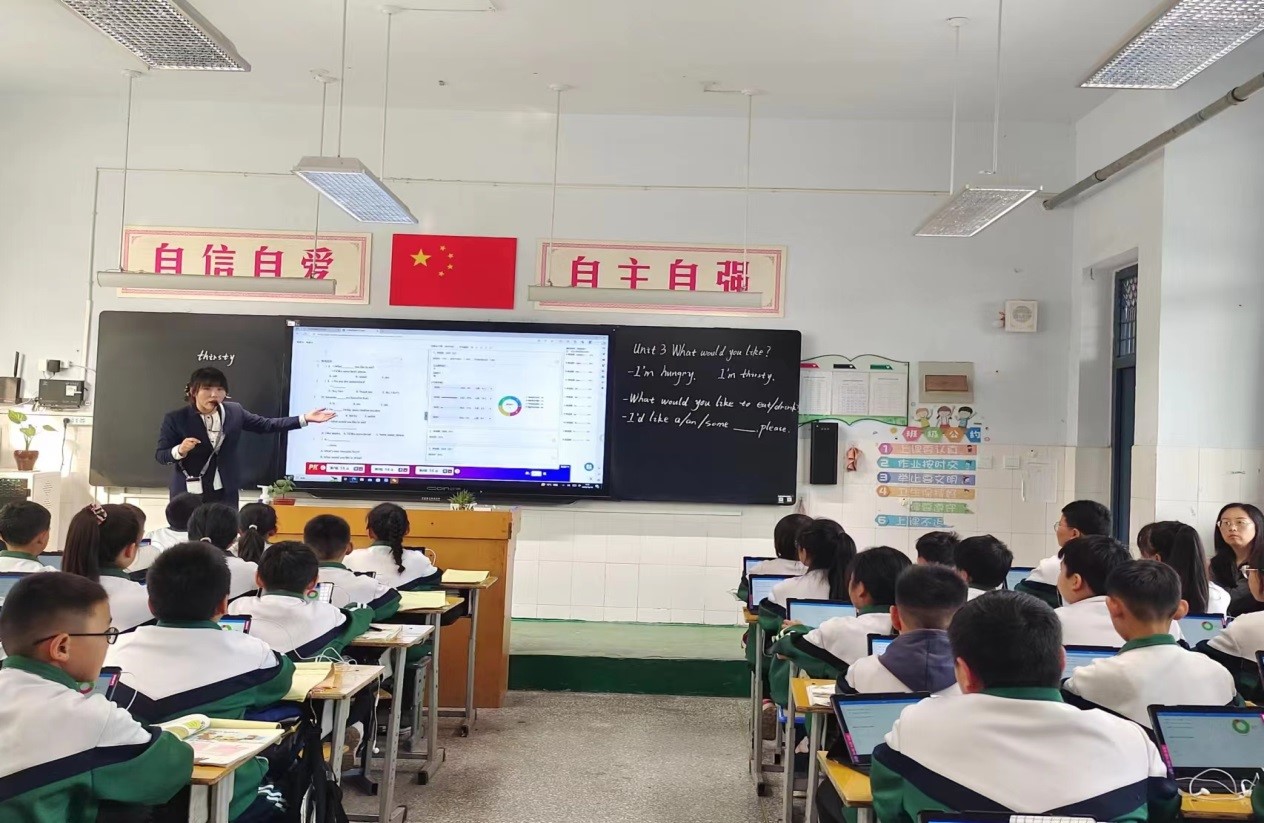 ? ? ? ? 首先,鶴壁科達學(xué)校數(shù)學(xué)老師張麗、英語老師張玉分別在朝陽小學(xué)兩個智慧課堂班進行第一節(jié)課的授課,語文老師陳瑞進行第二節(jié)授課。三位老師使用鶴壁科達學(xué)?!?511”智慧課堂教學(xué)模式,組織學(xué)生進行自學(xué)、互學(xué)、展學(xué)活動,借助ESWI智慧教育云系統(tǒng),運用搶答、抽答、小組PK等功能,調(diào)動學(xué)生學(xué)習(xí)的主動性、積極性;通過設(shè)置作品展示、教學(xué)投票等活動,激發(fā)學(xué)生的合作交流及表達展示潛能;使用在線測試檢驗學(xué)生學(xué)習(xí)效果,依據(jù)數(shù)據(jù)統(tǒng)計精準(zhǔn)教學(xué)。3節(jié)智慧課堂展示課充分發(fā)揮了學(xué)生的主觀能動性,學(xué)生在熱烈、自主的課堂氛圍中,學(xué)習(xí)知識,發(fā)展能力,讓學(xué)生真正從學(xué)習(xí)中有所收獲,在鍛煉中有所成長。