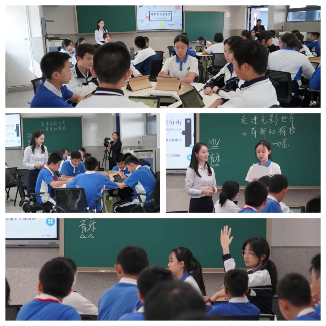 ? ? ? ? 信息技術(shù)學(xué)科組袁晨成老師為大家?guī)砹艘惶弥腔壅n堂融合影視藝術(shù)的綜合實踐大單元主題課程——《用影像記錄生活:小萌新初探?!?。學(xué)生在課堂上通過小組討論分析影視MV作品的表達技法和思想內(nèi)核,教師通過教學(xué)投票、作品展示引導(dǎo)學(xué)生全員參與、分享展示,主動提煉出影視作品常用表現(xiàn)手法。最后學(xué)生通過老師發(fā)布的智慧學(xué)習(xí)包,在學(xué)習(xí)引導(dǎo)和學(xué)習(xí)資源的幫助下,當(dāng)場創(chuàng)作了一段MV作品。教師借助實時學(xué)情及時調(diào)整教學(xué)策略,通過發(fā)起教學(xué)投票,引導(dǎo)學(xué)生全員參與進行生生互評。